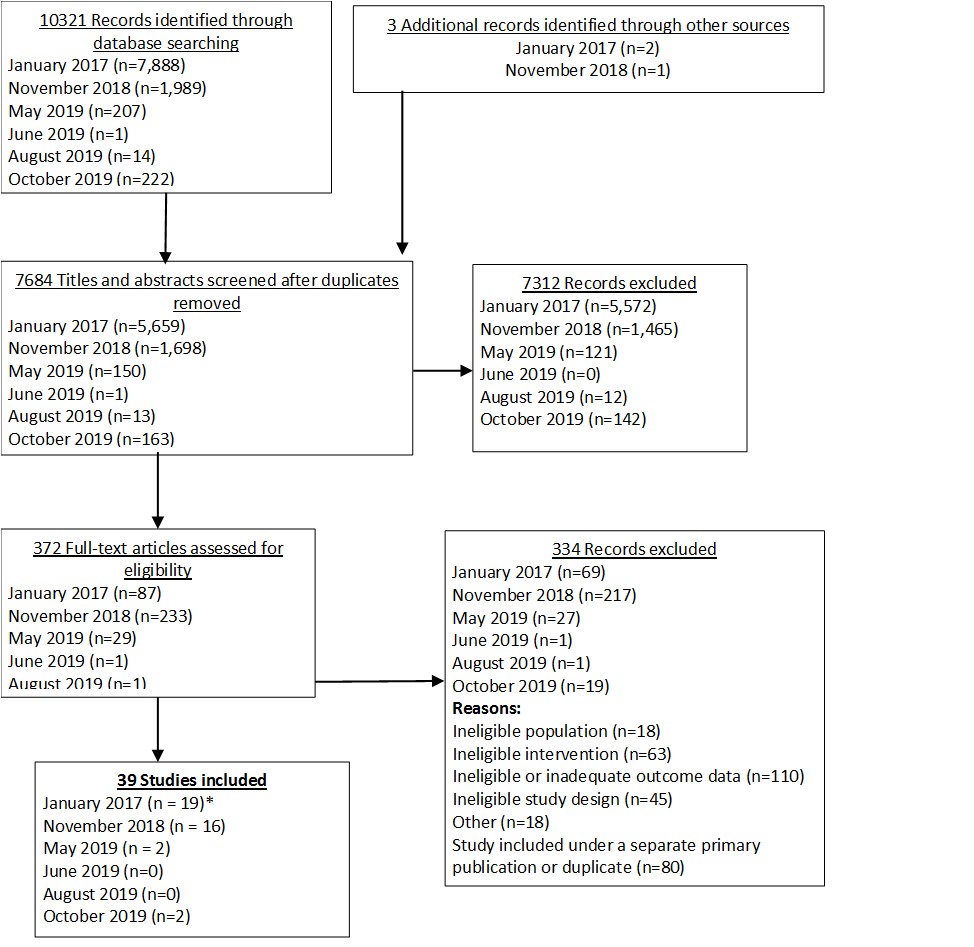 As of our baseline review, we reviewed 10,324 items and included 39 studies.