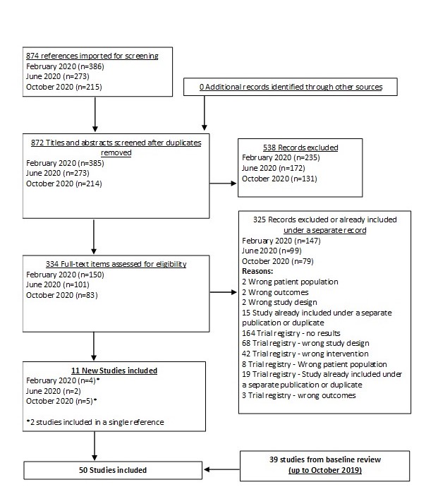 In our October 2020 search, we added 5 new eligible studies. There are a total of 50 studies now included in our review.