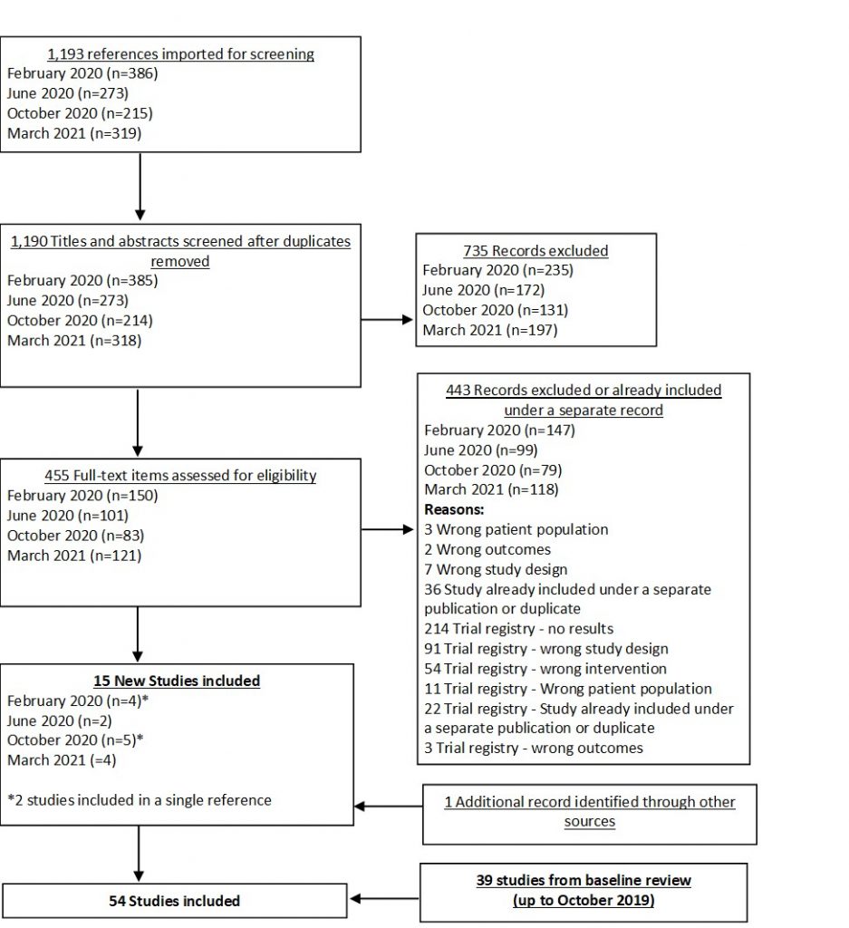 In our March 2021 search, we added 4 new eligible studies. There are a total of 54 studies now included in our review.